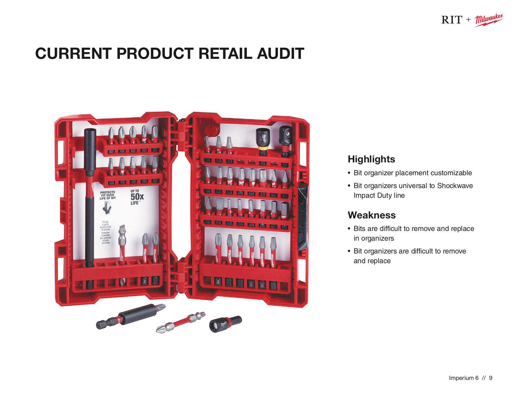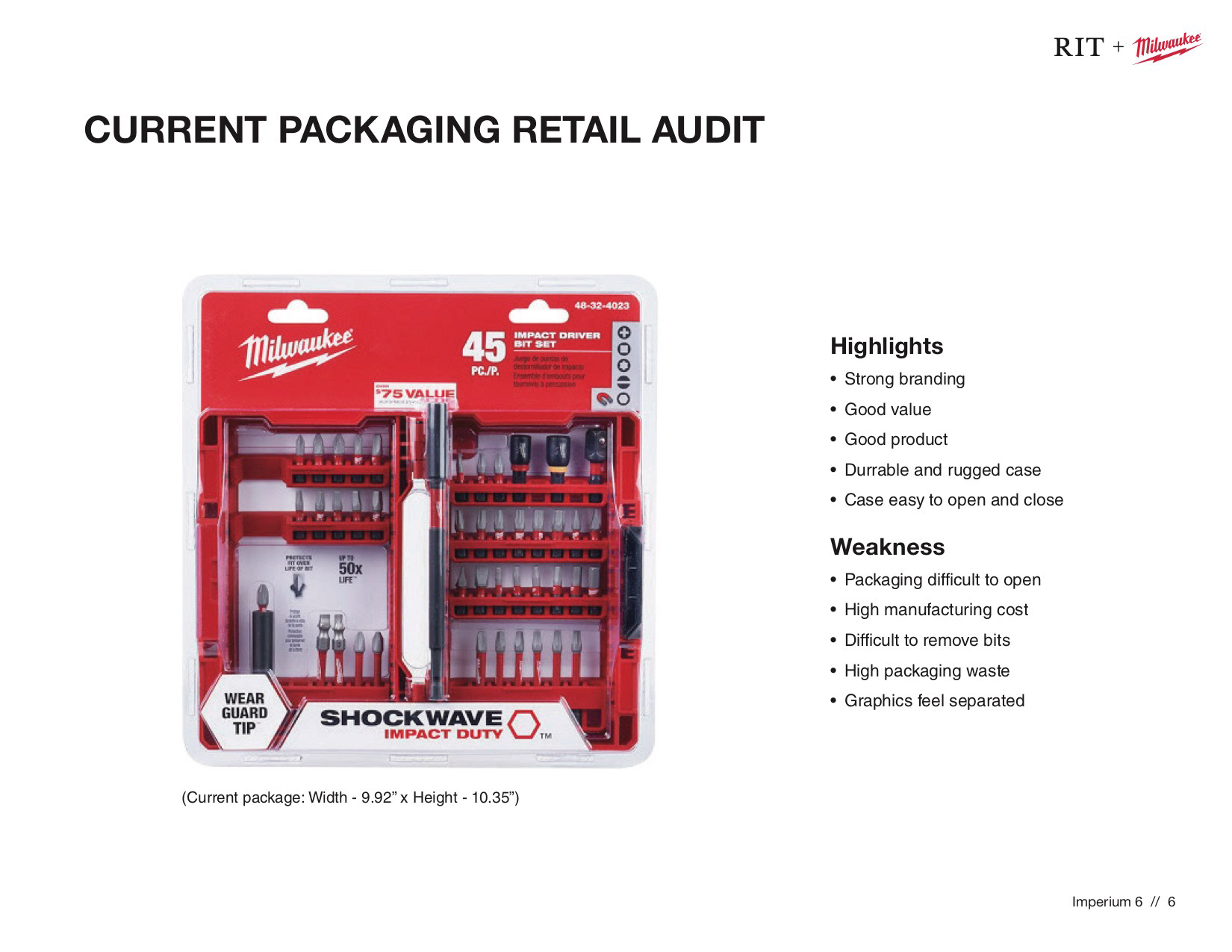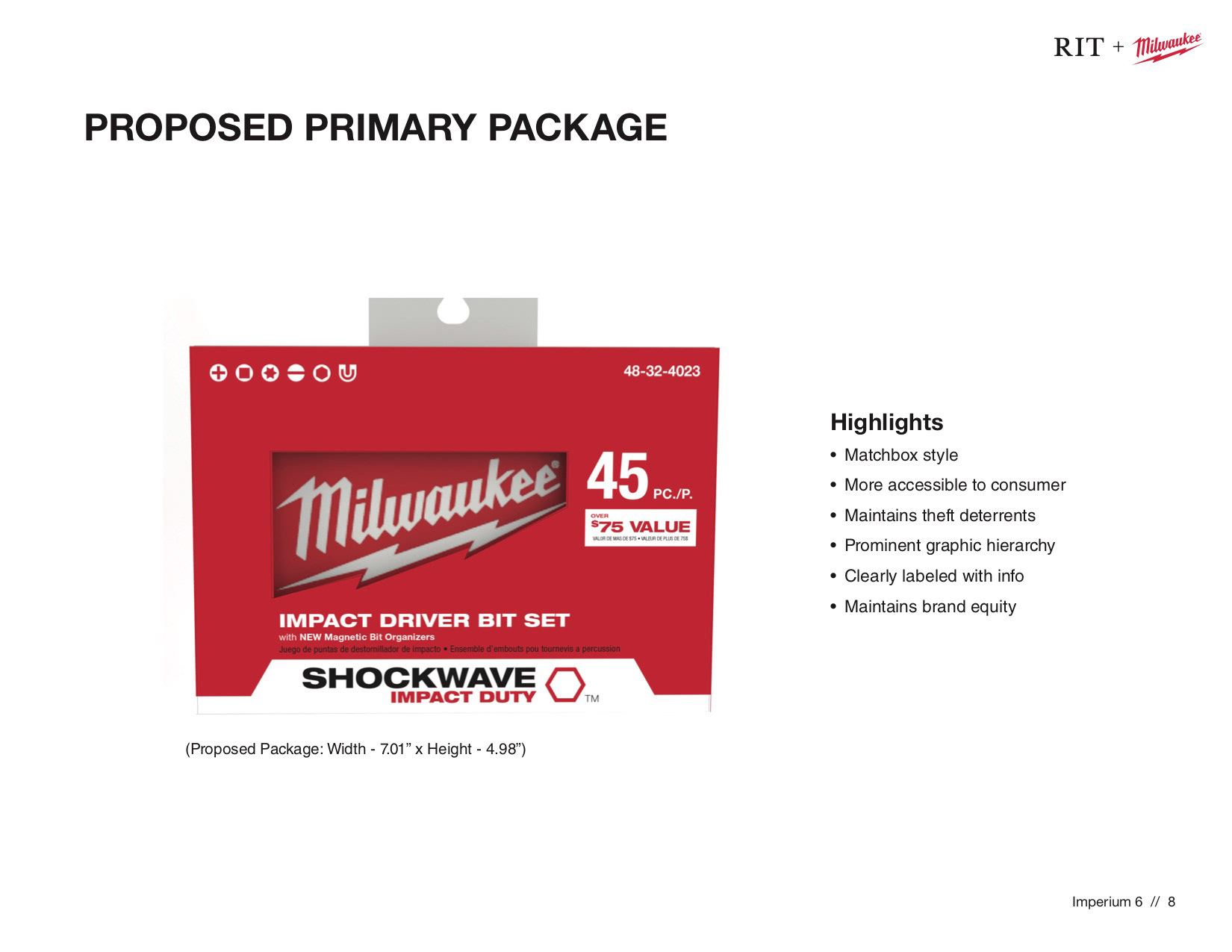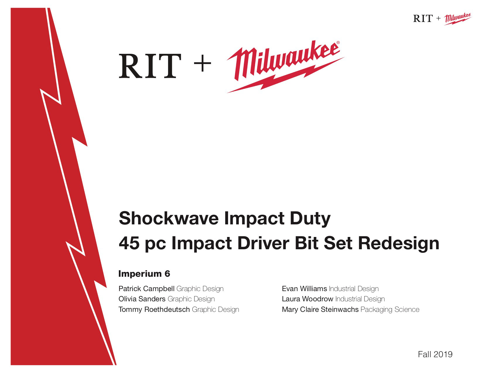 Consisting of a team of Graphic designers, industrial designers and a packaging science major. Our challenge was to create a new package for their Shockwave Impact Duty 45pc Impact Driver Bit Set.